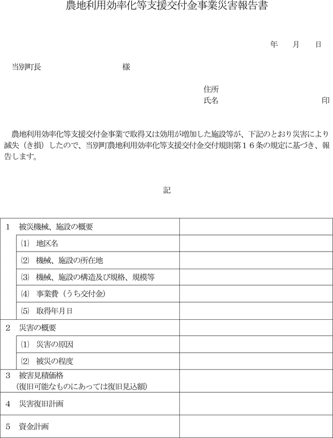 第16条 交付決定者は、交付金事業により取得又は効用の増加した財産が、処分制限期間内に天災、その他の災害により滅失又はき損したときは、農地利用効率化等支援交付金事業災害報告書(