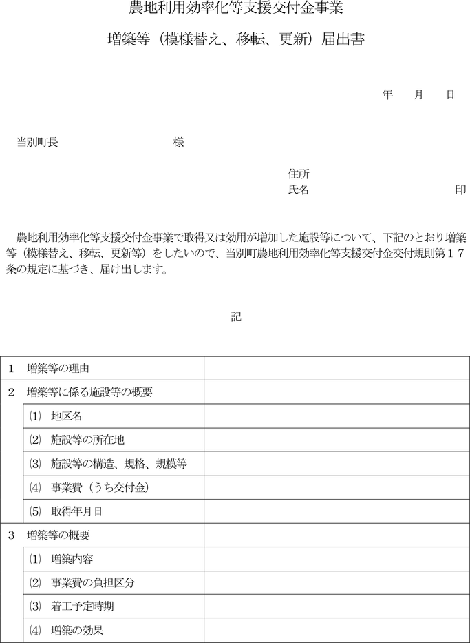 第17条 交付決定者は、交付金事業により取得した施設等の移転、若しくは更新又は生産能力、利用規模、利用方法等に影響を及ぼす増築又は模様替え等を処分制限期間内に行うときは、農地利用効率化等支援交付金事業増築等(模様替え、移転、更新)届出書(