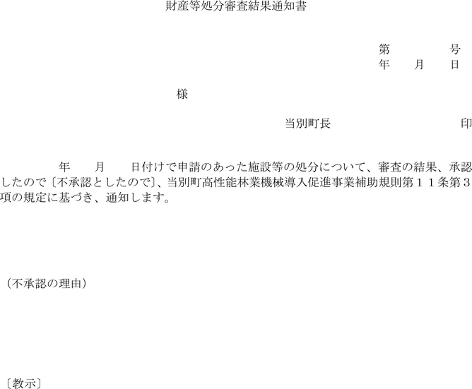 3 町長は、前項の規定による申請があった場合は、審査をし、財産等処分審査結果通知書(