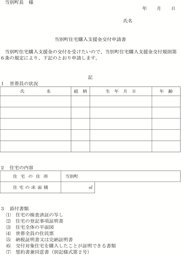 第6条 交付申請者は、交付対象住宅の所有権に関する登記が完了した日から起算して180日以内に、当別町新築住宅購入支援金交付申請書(