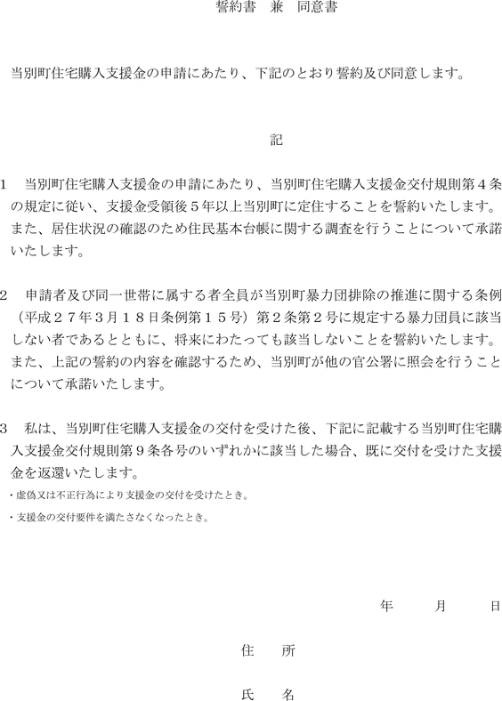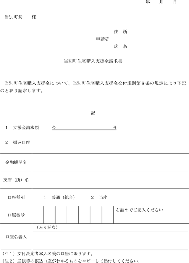 第8条 前条の規定による交付決定を受けた者(以下「交付決定者」という。)は、当別町新築住宅購入支援金請求書(