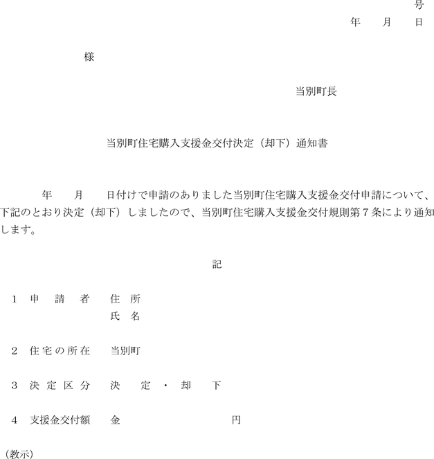 第7条 町長は、前条の申請書の提出があったときは、速やかにその内容を審査し、当該申請者に対し当別町新築住宅購入支援金交付決定(却下)通知書(