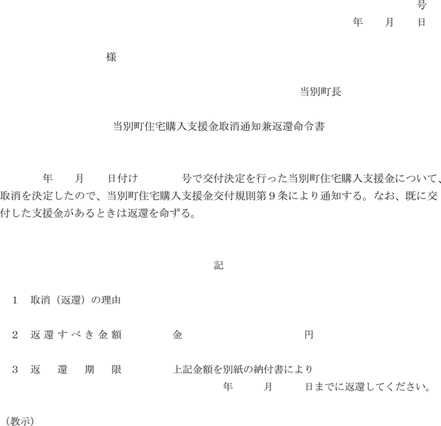 2 町長は、前項の規定により支援金の交付決定を取り消し又は交付した支援金の返還を命ずる場合は、当別町新築住宅購入支援金取消通知兼返還命令書(