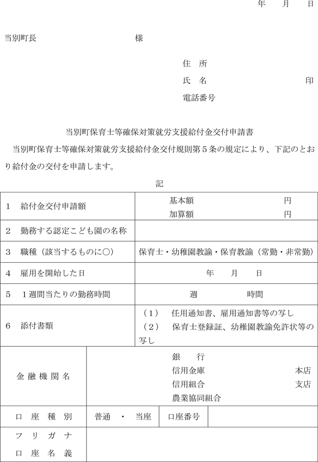 第5条 給付金の交付を受けようとする保育士等は、当別町保育士等確保対策就労支援給付金交付申請書(