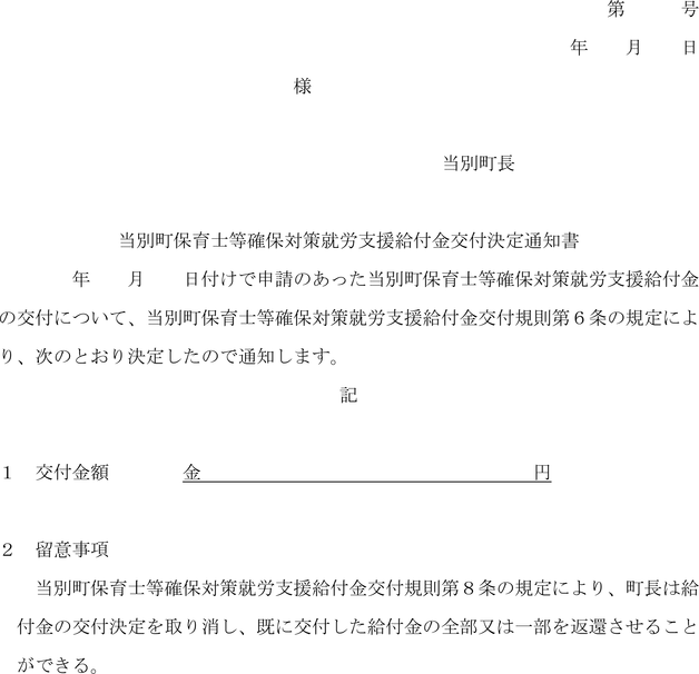 第6条 町長は、前条の規定による申請を受けたときは、その内容を審査し、交付することを決定したときは、当別町保育士等確保対策就労支援給付金交付決定通知書(