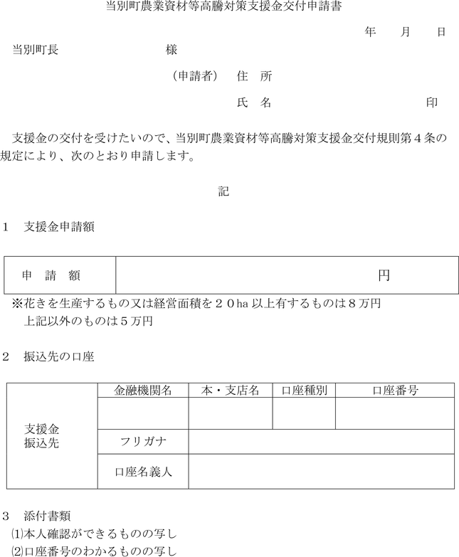 第4条 支援金の交付を受けようとするものは、町長が定める日までに当別町農業資材等高騰対策支援金交付申請書(