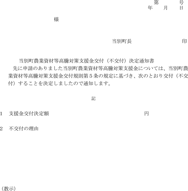 2 町長は、前項の規定により交付の可否を決定したときは、当別町農業資材等高騰対策支援金交付(不交付)決定通知書(