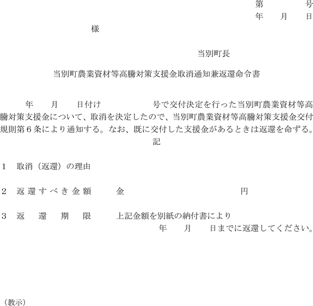2 町長は、前項の規定により支援金の交付決定を取り消し、又は交付した支援金の返還を命ずる場合は、当別町農業資材等高騰対策支援金取消通知兼返還命令書(