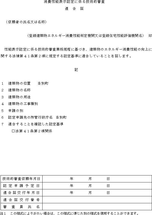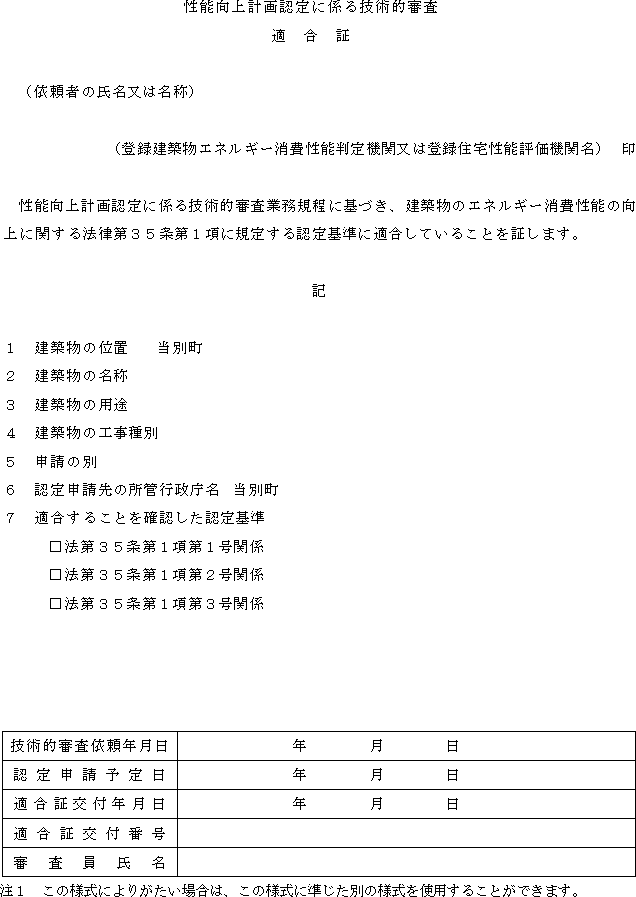 別記様式第3号。以下「計画適合証」という。)、消費性能表示認定に係る技術的審査適合証(