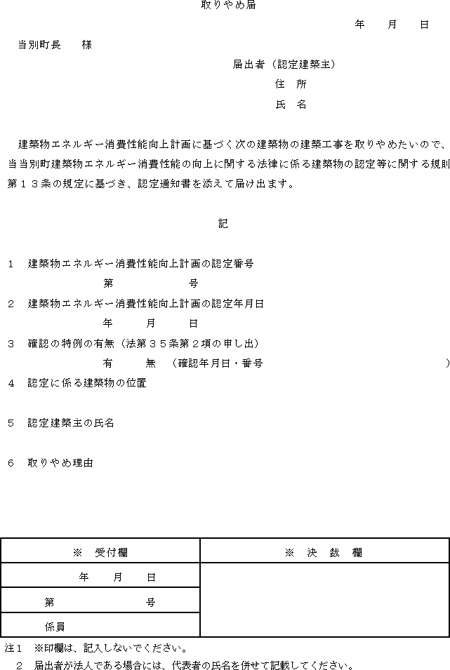 第13条 法第35条第1項の認定建築主(第9条第1項の規定により計画の認定を受けた者をいう。以下同じ。)は、同条の認定を受けた計画の建築を取りやめるときは、取りやめ届(