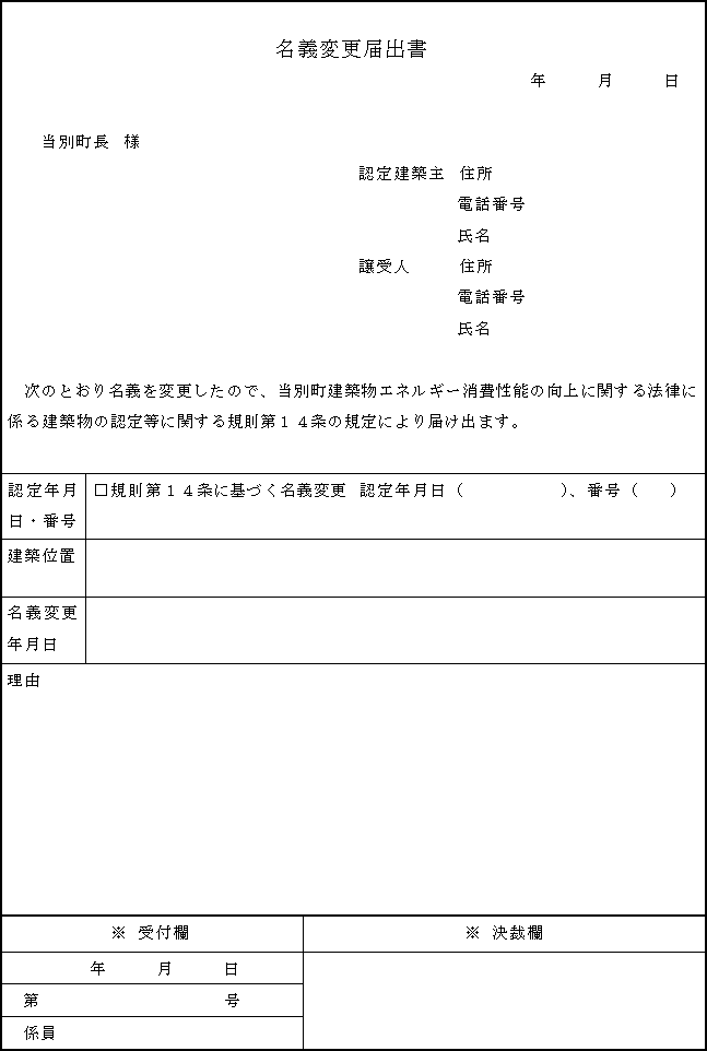 第14条 認定建築主が計画に基づく建築物又は住戸を譲受人に譲り渡した場合、認定建築主又は譲受人は、単独又は共同して当該建築物又は住戸の名義を変更した旨を名義変更届出書(