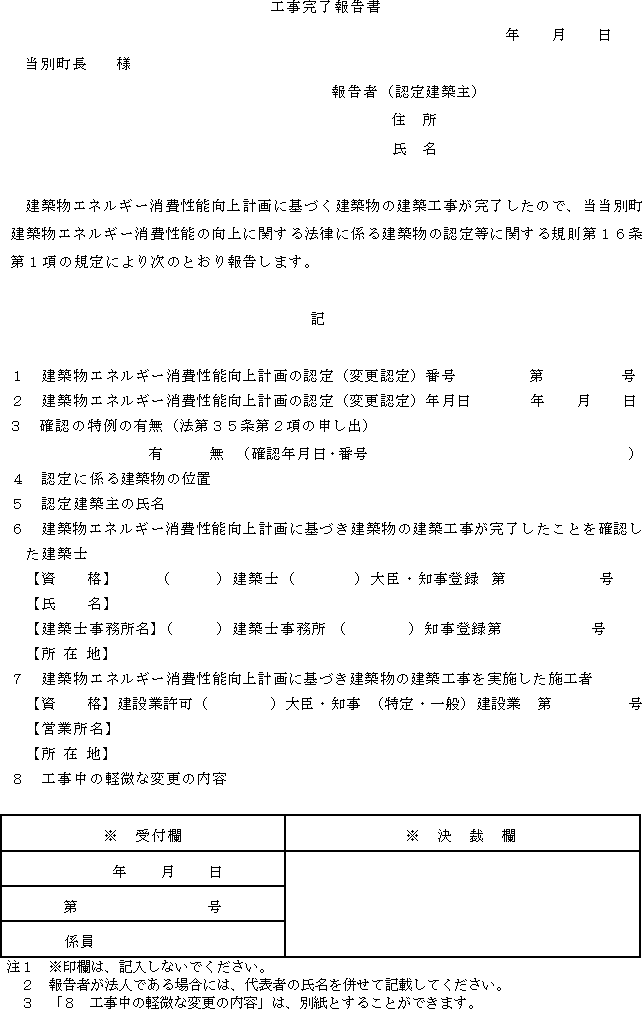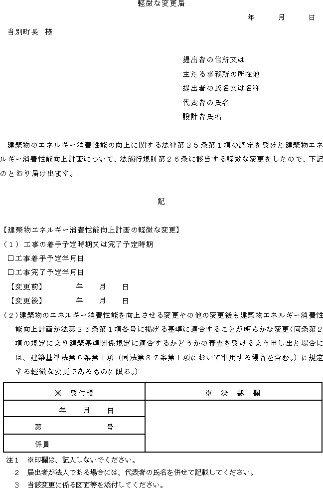 第4条 適合性判定の申請を行った建築主は、当別町建築主事から基準法第7条第5項又は第18条第18項に規定する検査済証の交付を受けようとする場合、前条の計画の変更が、省令第3条の軽微な変更に該当していることを説明する建築物エネルギー消費性能確保計画に係る軽微な変更説明書(