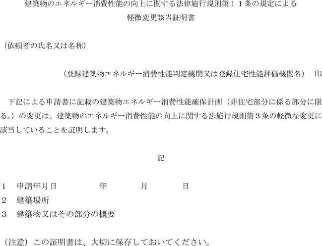 別記様式第2号)の交付を登録省エネ判定機関に求め、当該軽微変更該当証明書又はその写しを軽微変更該当説明書に添付するものとする。