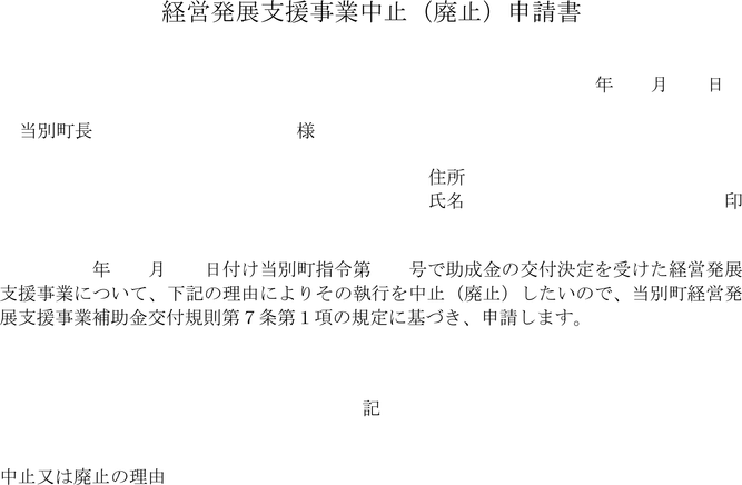 第7条 交付決定者は、やむを得ず支援事業を中止又は廃止するときは、経営発展支援事業中止(廃止)申請書(