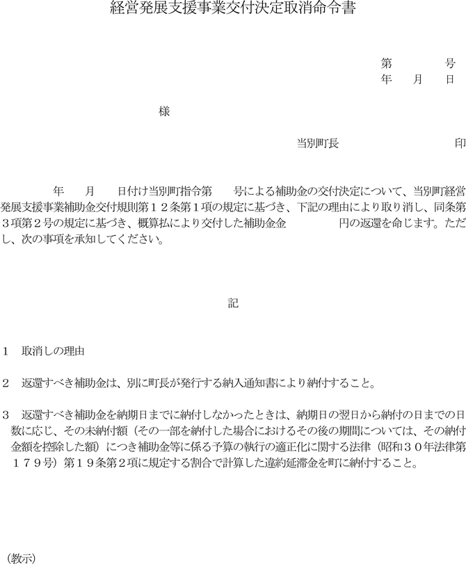 別記様式第24号)により通知するものとする。この場合において、承認を得て財産を処分したことにより収入があったときは、町長は、当該収入の全部又は一部を経営発展支援事業施設等処分収入納付命令書(