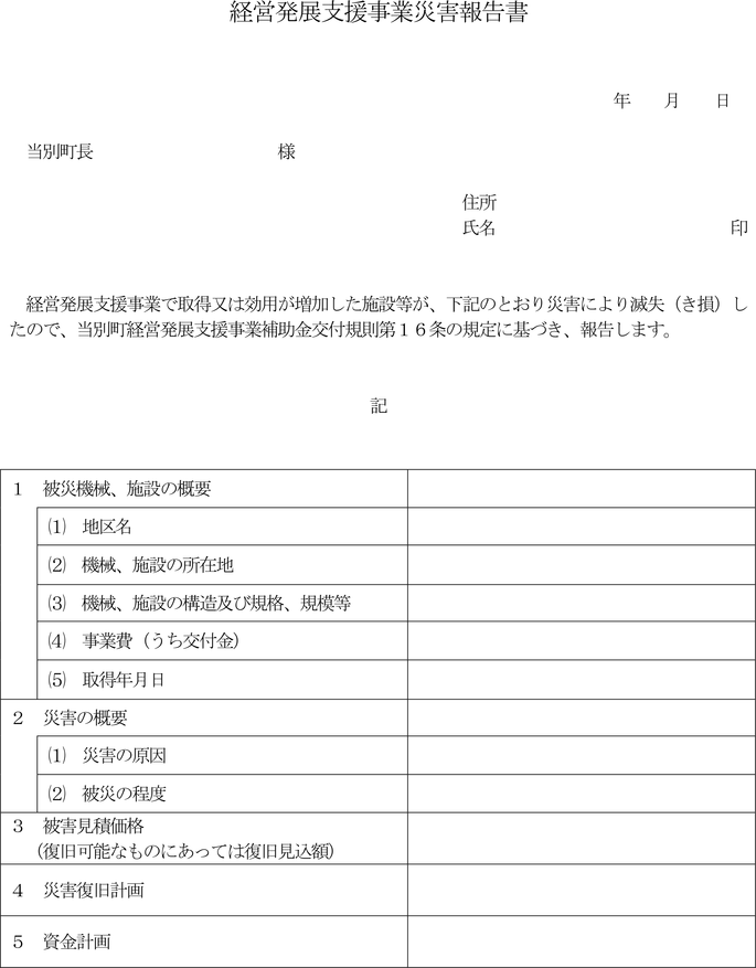 第16条 交付決定者は、支援事業により取得又は効用の増加した財産が、処分制限期間内に天災、その他の災害により滅失又はき損したときは、経営発展支援事業災害報告書(