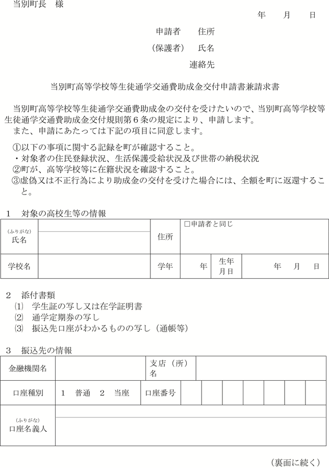 第6条 助成金の交付を受けようとする保護者等は、対象となる通学定期券を購入した日の属する年度の3月31日までに、当別町高等学校等生徒通学交通費助成金交付申請書兼請求書(