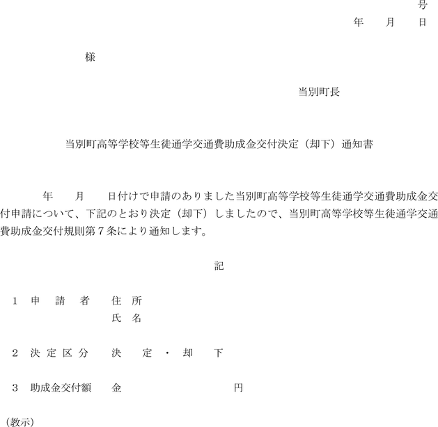 第7条 町長は、前条の申請書の提出があったときは、速やかにその内容を審査し、当該申請者に対し当別町高等学校等生徒通学交通費助成金交付決定(却下)通知書(