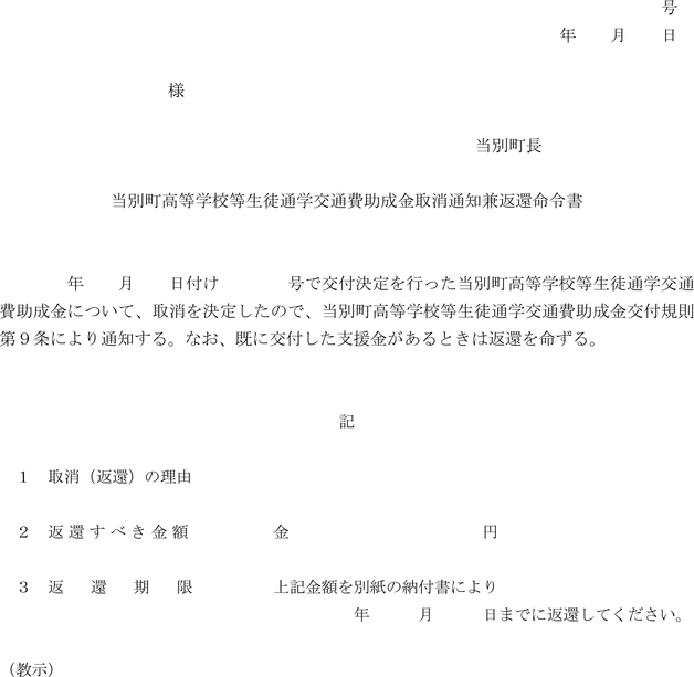 2 町長は、前項の規定により助成金の交付決定を取り消し又は交付した助成金の返還を命ずる場合は、当別町高等学校等生徒通学交通費助成金取消通知兼返還命令書(