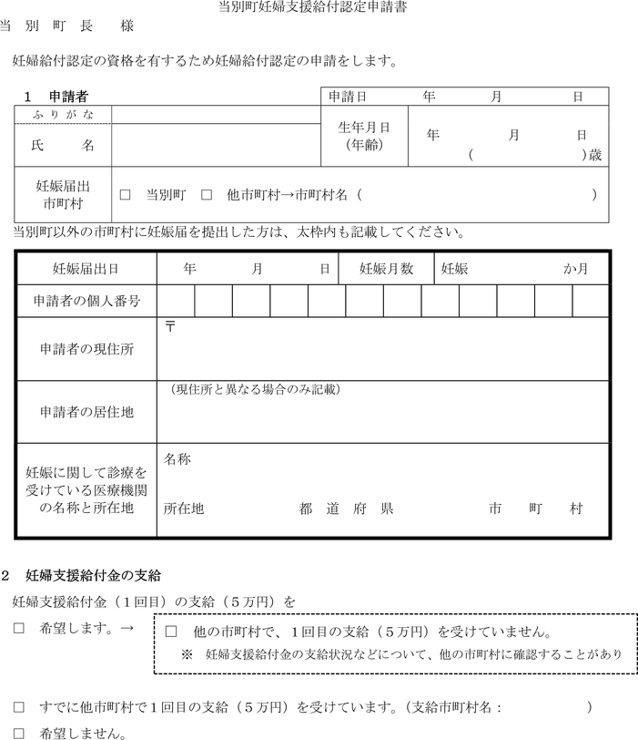 第3条 法第10条の9に規定する認定を受けようとする者(以下「妊婦給付認定申請者」という。)は、当別町妊婦給付認定申請書(