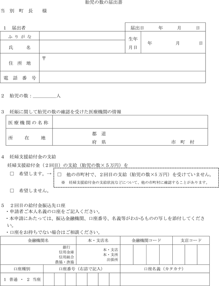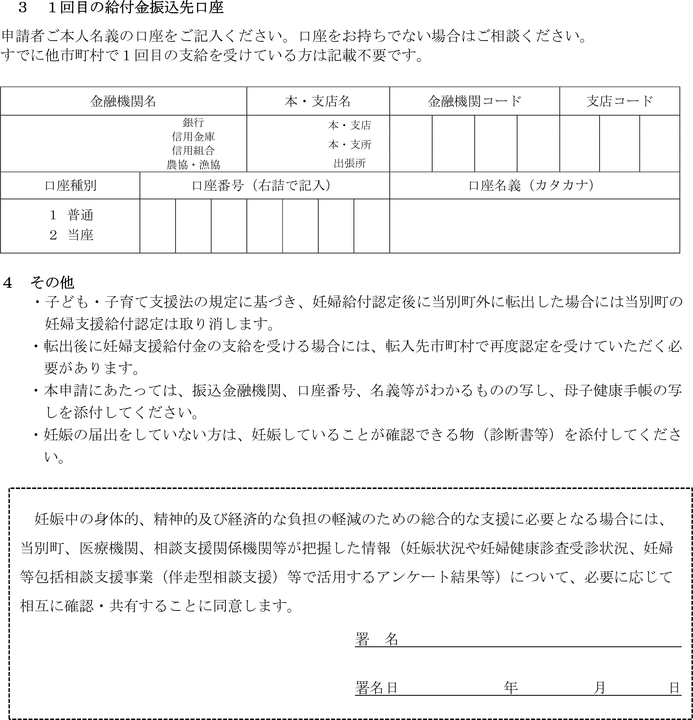 別記様式第1号)に、給付金振込金融機関口座が確認できるものの写し(以下「口座確認書類」という。)及び母子健康手帳の写しを添えて、妊娠の確定日から2年を経過する日までに町長に申請しななければならない。