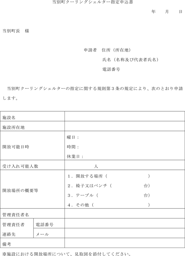 第3条 クーリングシェルターの指定を受けようとする施設(町が管理するものを除く。)の管理者は、当別町クーリングシェルター指定申込書(