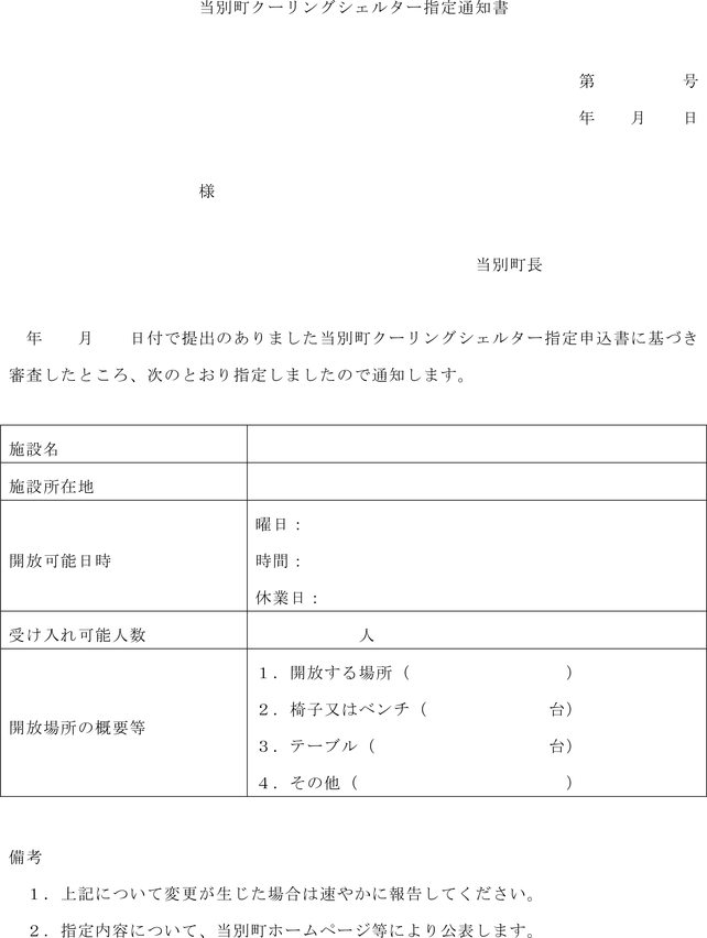 第4条 町長は、前条の規定による申請があったときは、その内容を審査し、適当と認めたときは、当別町クーリングシェルター指定通知書(