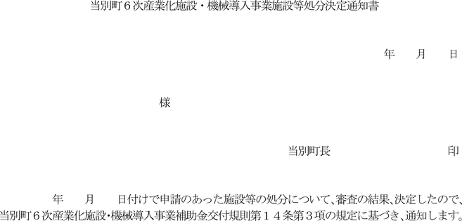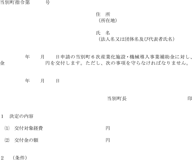 2 前項の規定により交付決定を行うときは、補助金の交付決定を受けた補助対象者(以下「交付決定者」という。)に対し、当別町6次産業化施設・機械導入事業補助金交付決定通知書(