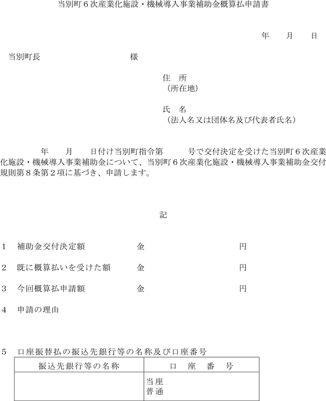 2 交付決定者は、前項ただし書の規定により、補助金の概算払を受けようとするときは、当別町6次産業化施設・機械導入事業補助金概算払申請書(