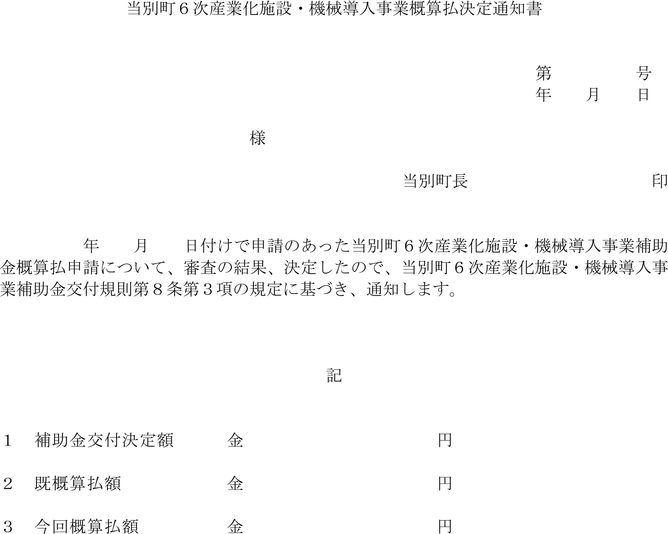 3 町長は、前項に規定する申請があったときは、その内容を審査し、概算払いをすべきものと認めたときは、当該交付決定者に対し、当別町6次産業化施設・機械導入事業補助金概算払決定通知書(