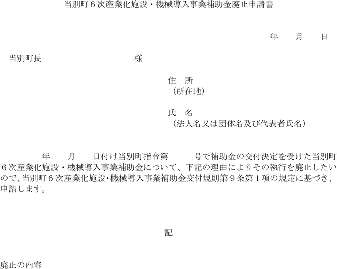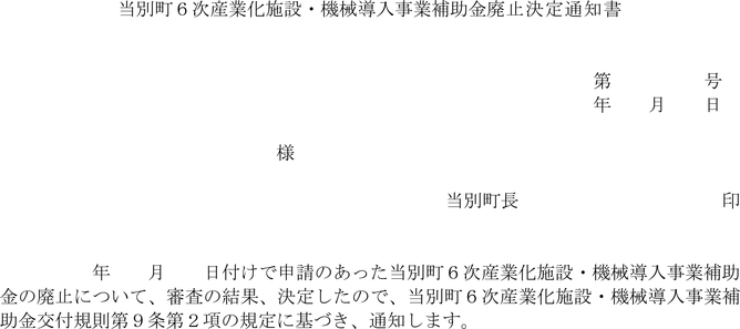 第9条 交付決定者は、やむを得ず事業を廃止するときは、当別町6次産業化施設・機械導入事業補助金廃止申請書(