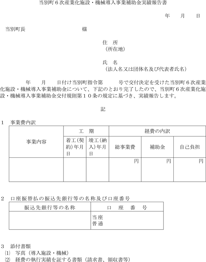 第10条 交付決定者は、導入事業が完了したときは、速やかに当別町6次産業化施設・機械導入事業補助金実績報告書(