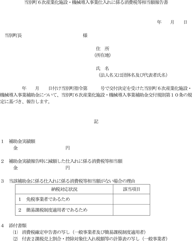 別記様式第8号)及び当別町6次産業化施設・機械導入事業仕入れに係る消費税等相当額報告書(