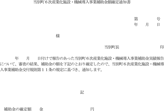第11条 町長は、前条の規定による報告があったときは、交付すべき補助金の額を確定し、当該交付決定者に対し、当別町6次産業化施設・機械導入事業補助金額確定通知書(