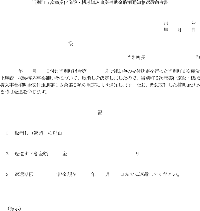 2 町長は、前項の規定により補助金の交付決定を取消し又は交付した補助金の返還を命ずる場合は、当別町6次産業化施設・機械導入事業補助金取消通知兼返還命令書(