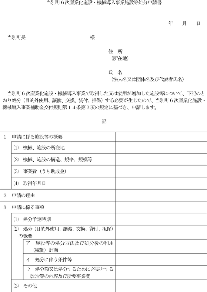 第6条 補助金の交付を受けようとするものは、当別町6次産業化施設・機械導入事業補助金交付申請書(