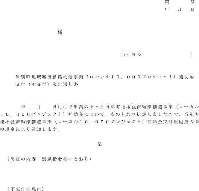第5条 町長は、前条の規定による補助金の交付の申請があったときは、その内容を審査し、申請者に対し、当別町地域経済循環創造事業(ローカル10,000プロジェクト)補助金交付(不交付)決定通知書(