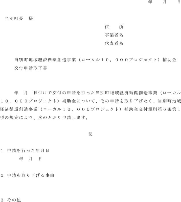 第6条 前条の規定により補助金の交付決定を受けたもの(以下「補助事業者」という。)は、当該交付決定の内容に不服があるときには、補助金の交付の決定の日から起算して20日を経過する日までに、当別町地域経済循環創造事業(ローカル10,000プロジェクト)補助金交付申請取下書(
