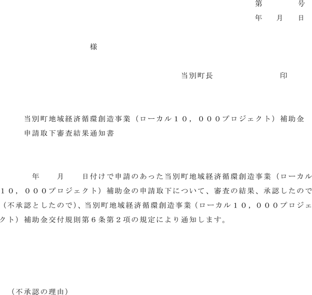 2 町長は、前項に規定する申請があったときは、その内容を審査し、補助事業者に対し、当別町地域経済循環創造事業(ローカル10,000プロジェクト)補助金申請取下審査結果通知書(