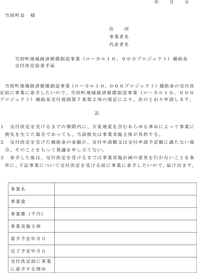 2 補助事業者は、当該年度において補助対象事業の円滑な実施を図る上で、交付決定前に着手する場合は、当別町地域経済循環創造事業(ローカル10,000プロジェクト)補助金交付決定前着手届(