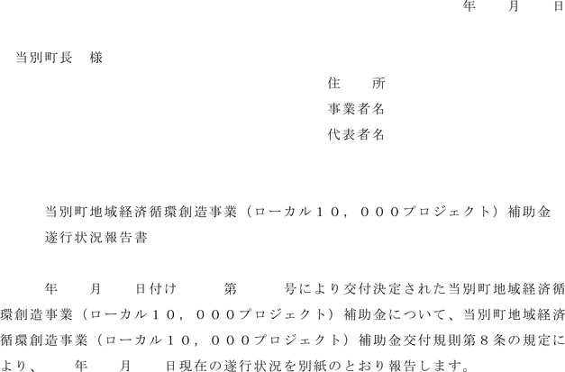 第8条 補助事業者は、町長から要求があった場合は、補助対象事業の遂行状況について、当別町地域経済循環創造事業(ローカル10,000プロジェクト)補助金遂行状況報告書(