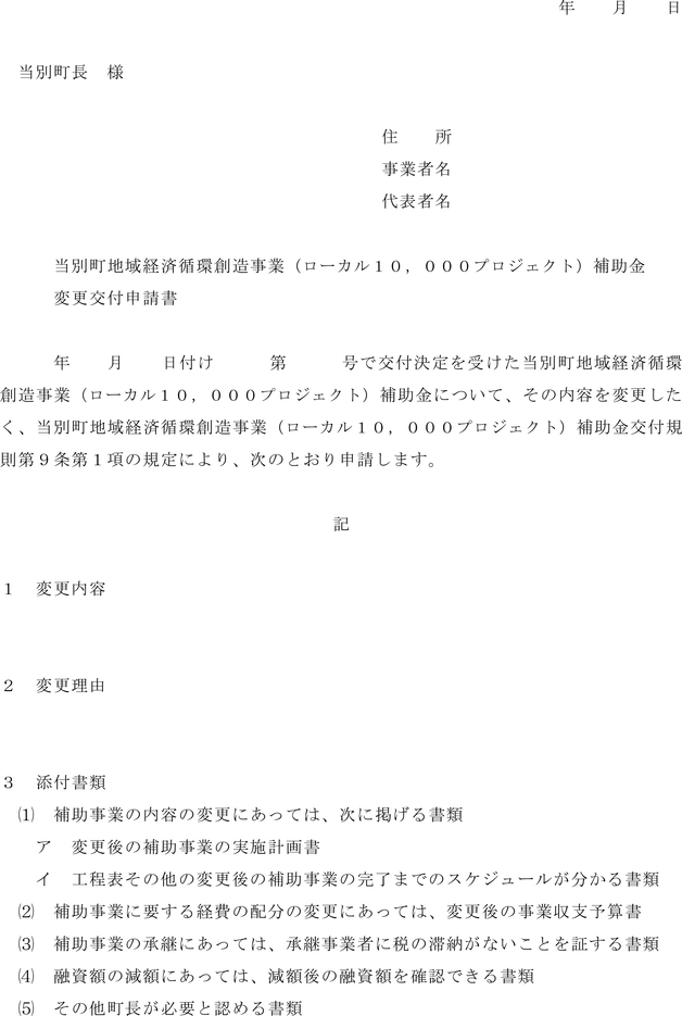 第9条 補助事業者は、交付要綱第13条第1項に規定する各号のいずれかに該当するときは、当別町地域経済循環創造事業(ローカル10,000プロジェクト)補助金変更交付申請書(