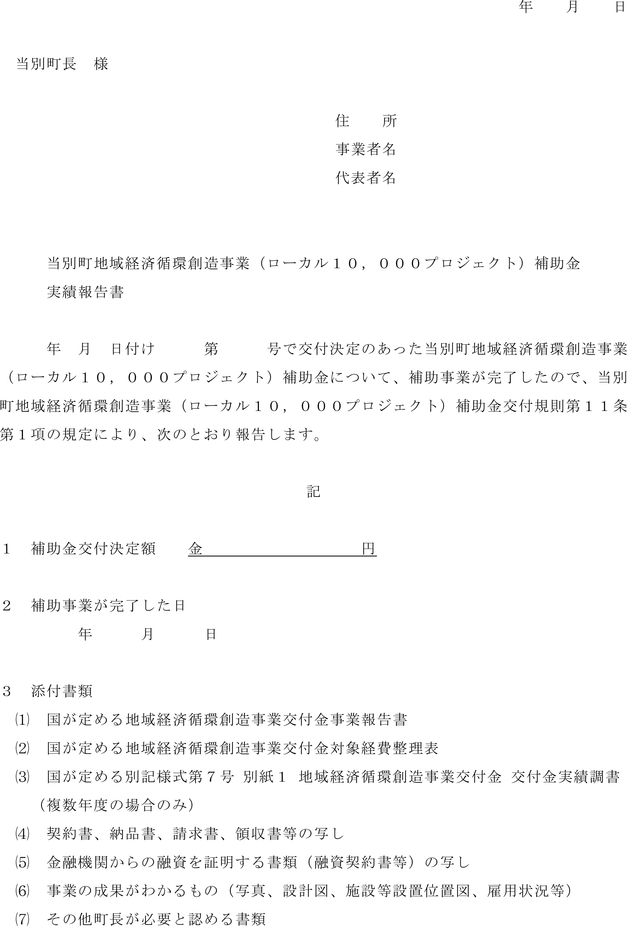 第11条 補助事業者は、補助対象事業が完了したときは、その日から起算して20日以内又は補助金の交付決定を受けた日の属する年度の3月31日のいずれか早い日までに、当別町地域経済循環創造事業(ローカル10,000プロジェクト)補助金実績報告書(