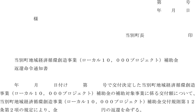 2 町長は、前項の規定により補助金の額を確定した場合において、既にその額を超える補助金が交付されているときは、当別町地域経済循環創造事業(ローカル10,000プロジェクト)補助金返還命令通知書(
