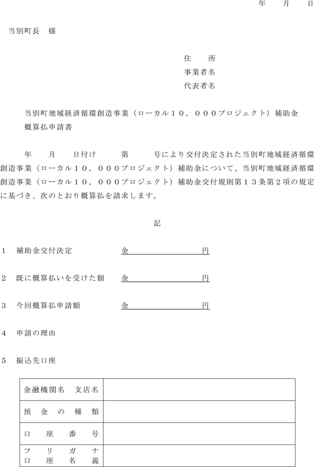 2 補助事業者は、補助金の概算払いを受けようとするときは、当別町地域経済循環創造事業(ローカル10,000プロジェクト)補助金概算払申請書(