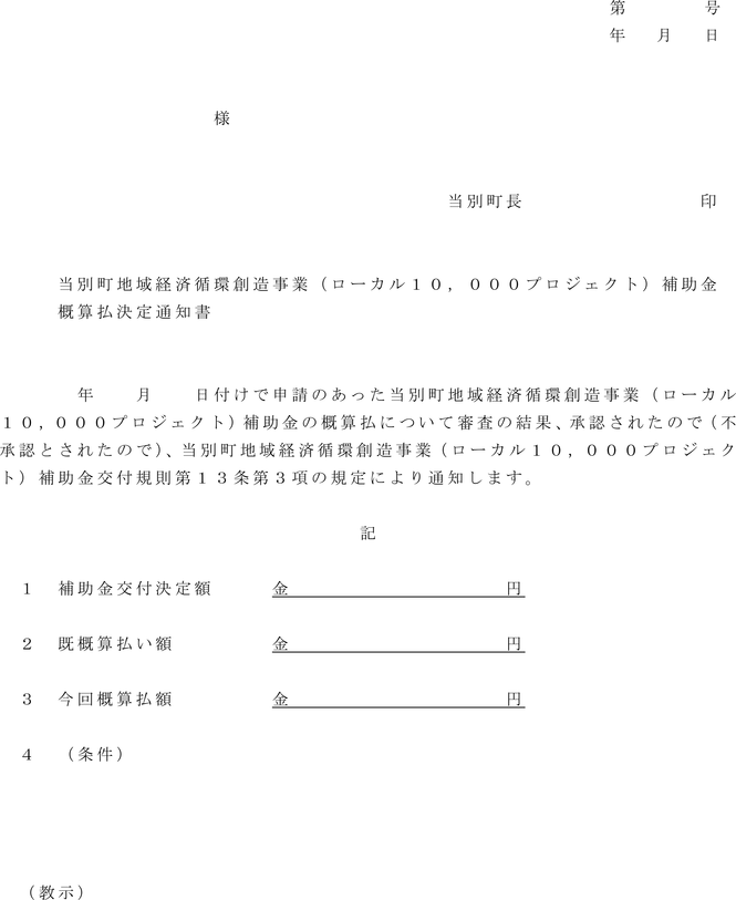 3 町長は、前項の申請に基づき補助金の概算払いをすることを決定したときは、当該補助事業者に対し、当別町地域経済循環創造事業(ローカル10,000プロジェクト)補助金概算払決定通知書(