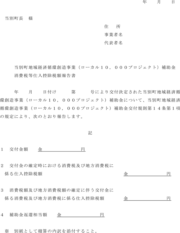 第14条 第4条第2項ただし書により交付の申請をした補助事業者は、第11条第1項の実績報告書を提出した後において、消費税及び地方消費税の申告により当該補助金の消費税等仕入控除税額が確定した場合には、その金額(第11条第3項の規定により減額した補助事業者については、その金額が減じた額を上回る部分の金額)を、当別町地域経済循環創造事業(ローカル10,000プロジェクト)補助金消費税等仕入控除税額報告書(