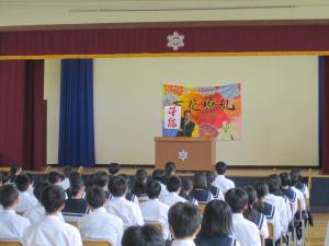 生徒会副会長・各学年代表生徒からのあいさつ、校長先生のお話、中体連の結果報告、表彰伝達、全道大会に向けての決意表明が行われました。