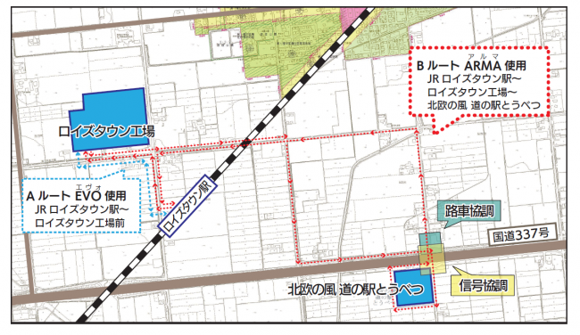 ロイズタウン駅周辺の賑わい創出に向けた取り組みとして、昨年度に引き続き自動運転バスの実証運行を行います。